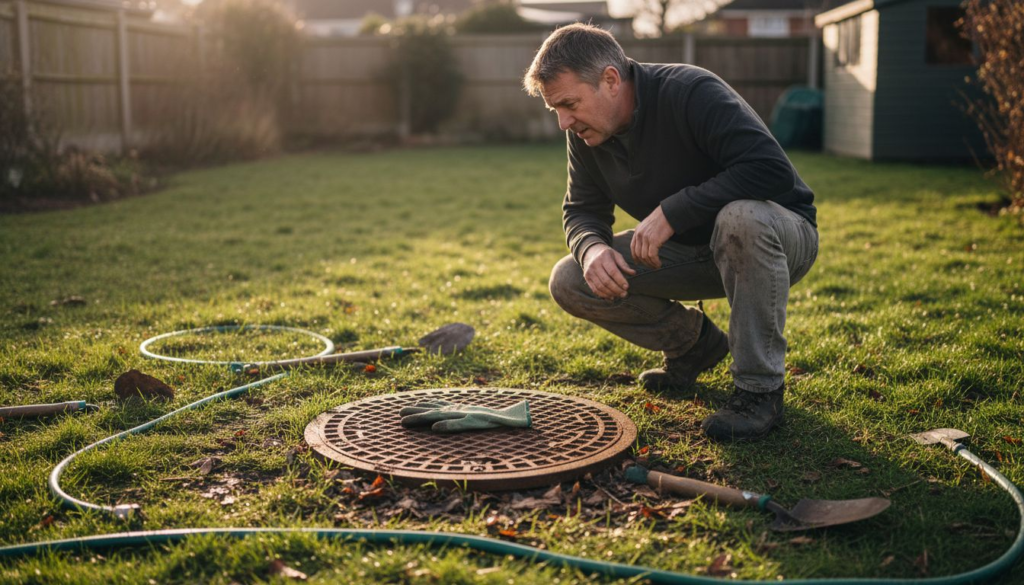- Check for blockages using a drainage rod or long-handled tool